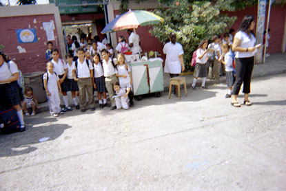 Plano medio. Exterior día. Niños junto a puesto de venta ambulante. Sobresale parasol en technicolor. Perfil de mujer en costado superior derecho.