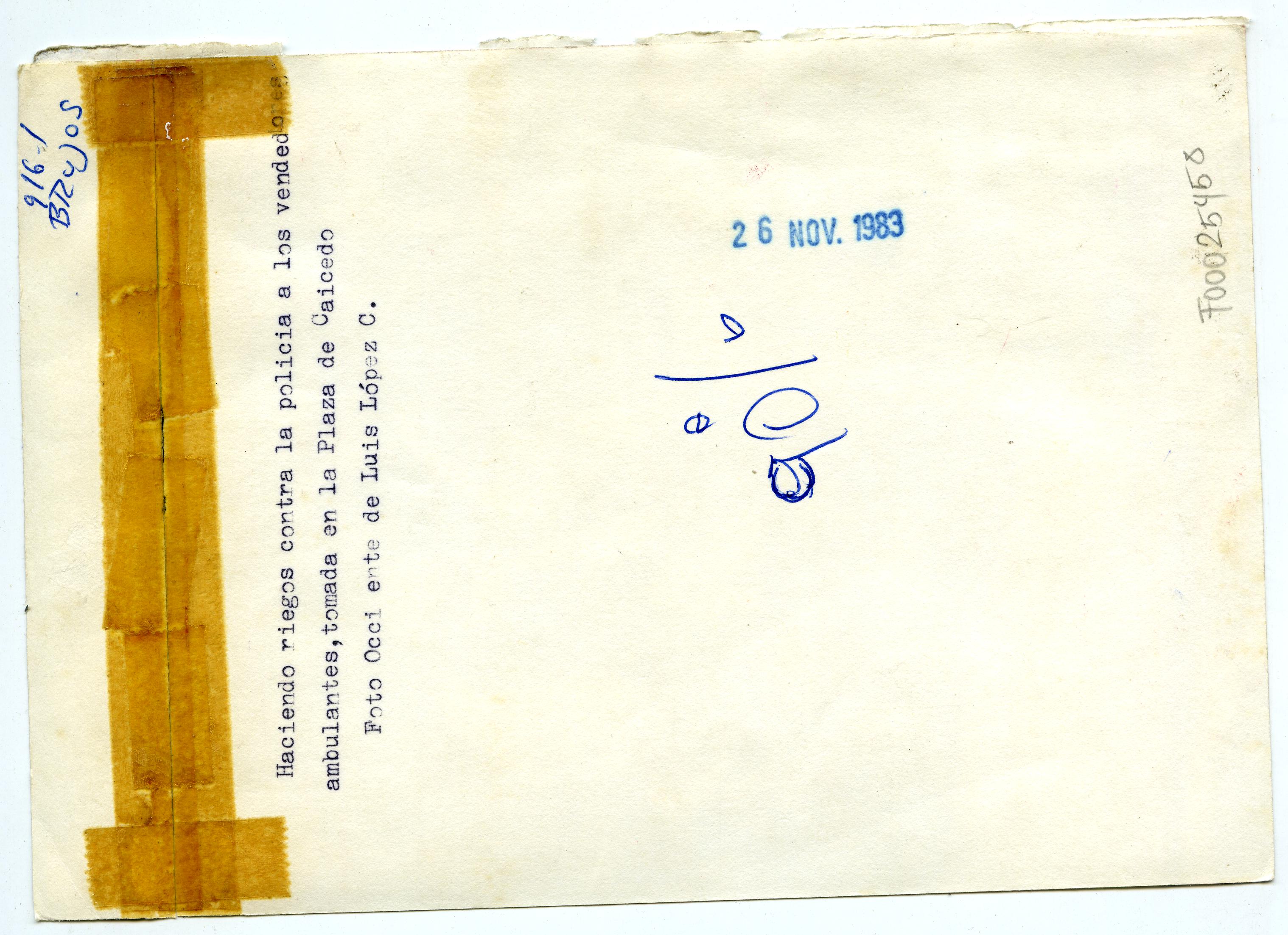 | dc.description.abstract | Reverso: Haciendo riegos contra la policía a los vendedores ambulantes, tomada en la plaza de Caicedo. Foto Occidente de Luis López | spa |