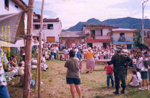 Barrio San Vicente, de arquitectura con fuerte influencia de la colonización Antioqueña, La comunidad en la celebración del día comunitario. El Aguila 1997.