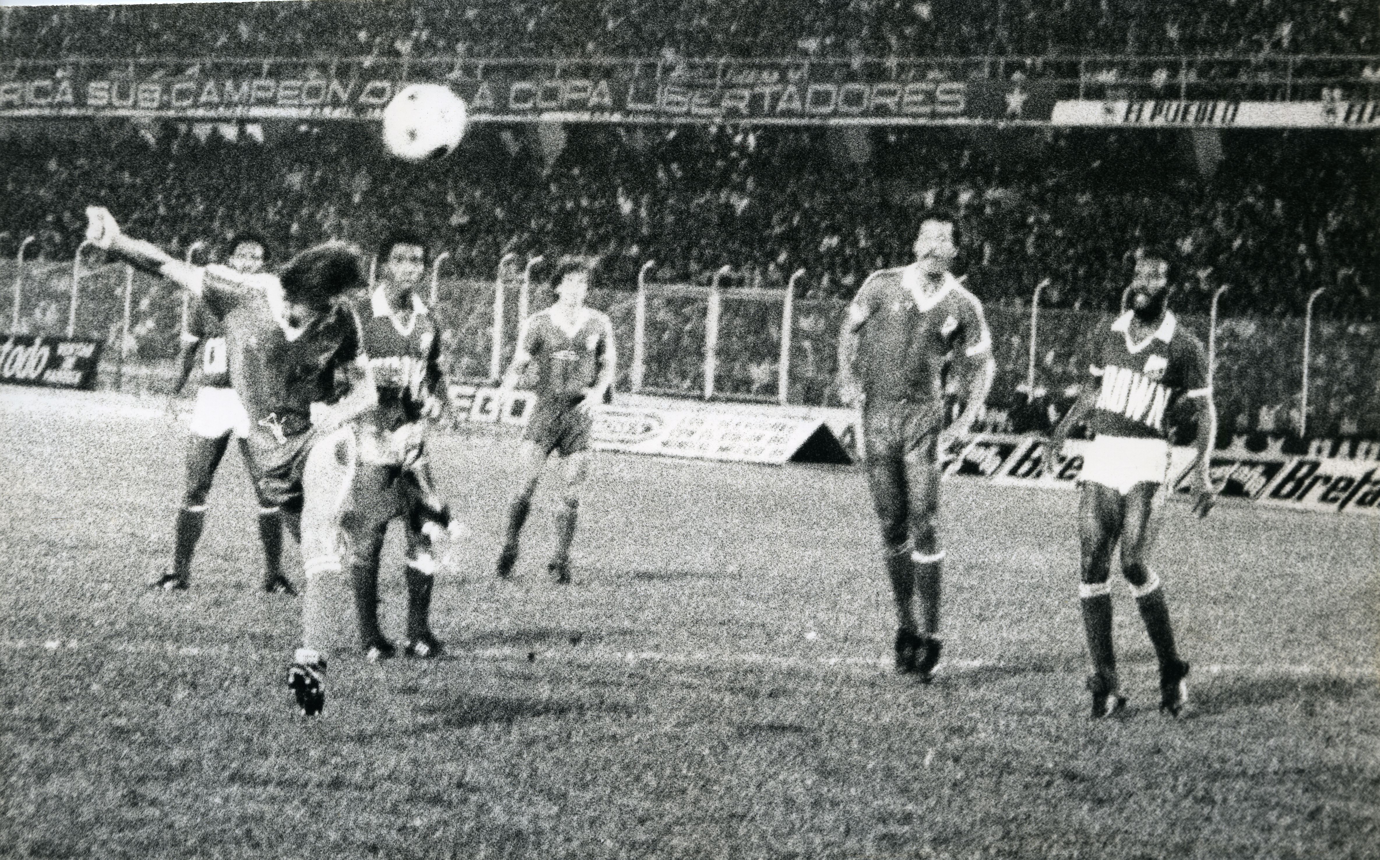 América de Cali, equipo de fútbol de la ciudad de Santiago de Cali, Valle del Cauca. Fue fundado oficialmente en el año 1927. Partido fútbol de noche entre los equipos América y Deportivo Cali, realizado en el estadio Pascual Guerrero de Cali. Se aprecia al delantero Américano rematar de cabeza con la mirada de Murillo y Penagos. Observamos público en la tribuna