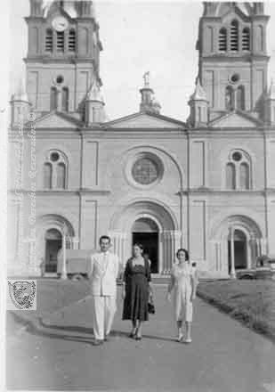 Fernando Reyes, Soledad Reyes Bueno y Lucía Reyes de Rojas, visitando la Basilíca del Señor de los Milagros. Buga. C. 1970.