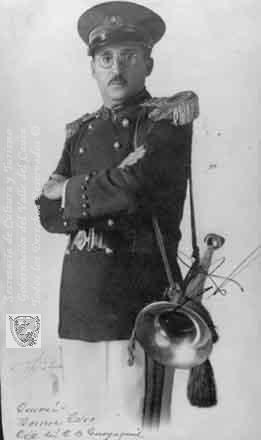 Fotografía del Coronel Aurelio Carrera Calvo. Comandante del cuerpo de bomberos de Guayaquil. portando su bocina de mando. C. 1939.