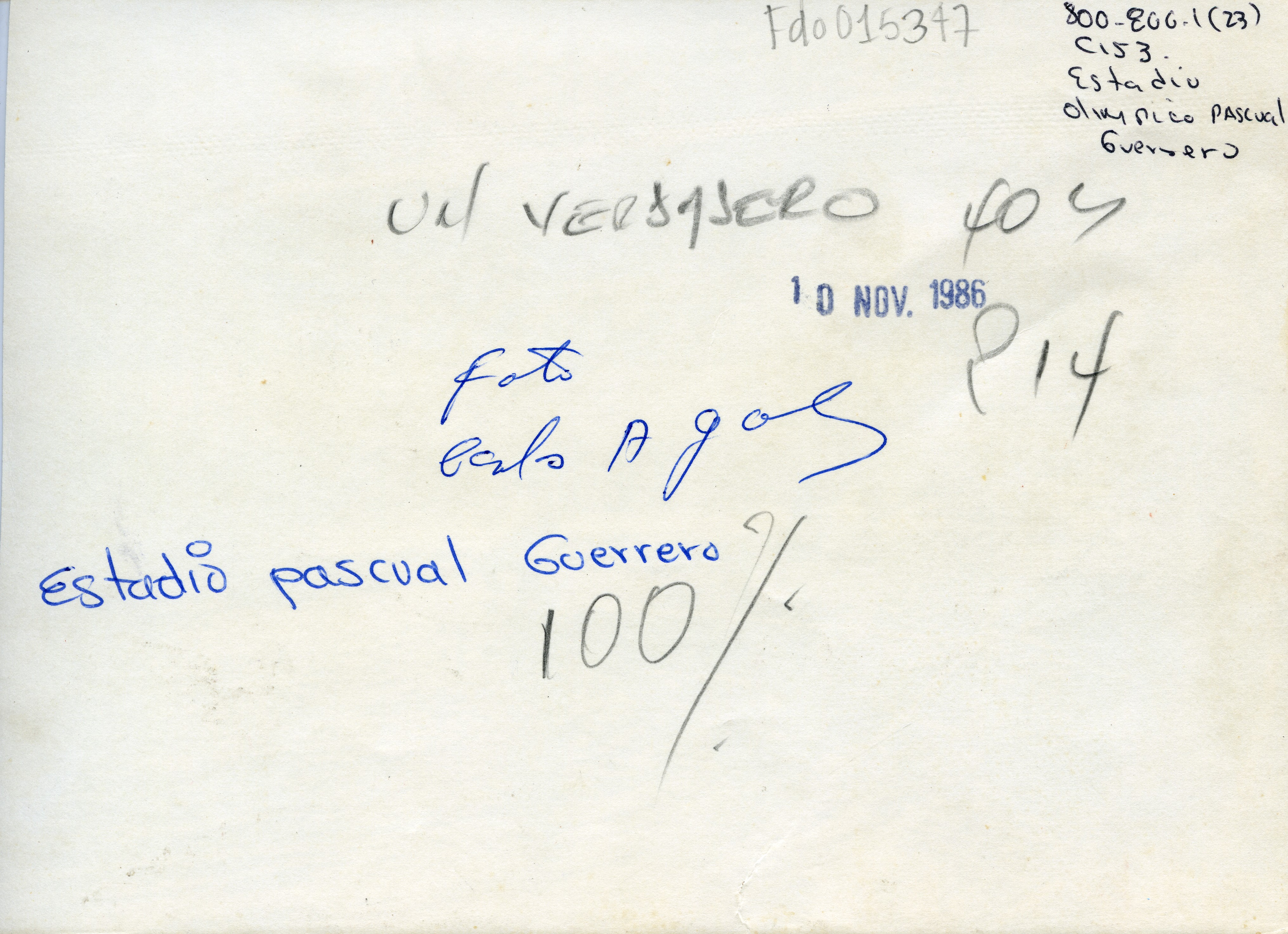 La fotografía da cuenta de la siguiente información: “Se observa el estadio lleno en partido del Deportivo Cali, llueve fuertemente que la cancha se inunda”.