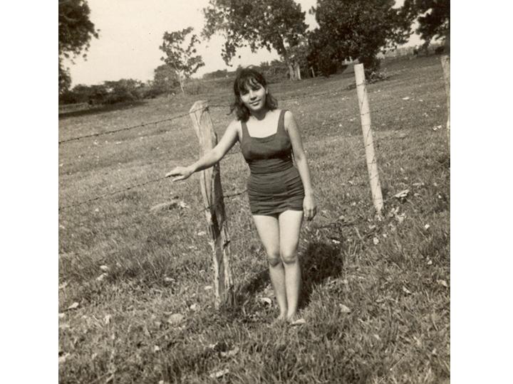 María Nercy García de paseo, luciendo un vestido de baño de los años sesenta