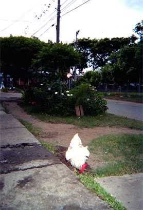 Plano medio. Exterior día. Gallo en franja inferior, como punto objetivo de enfoque. Vegetación de fondo, con detalle de flores blancas.