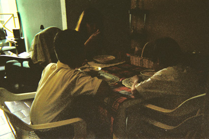Plano Medio. Imagen tomada en el interior de una vivienda, con escasas condiciones de luz. En la penumbra se aprecia un grupo conformado por una mujer y dos niños, sentados en una mesa compartiendo los alimentos, al fondo otra habitación que se destaca por la luz reflejada sobre un muro de color verde.
