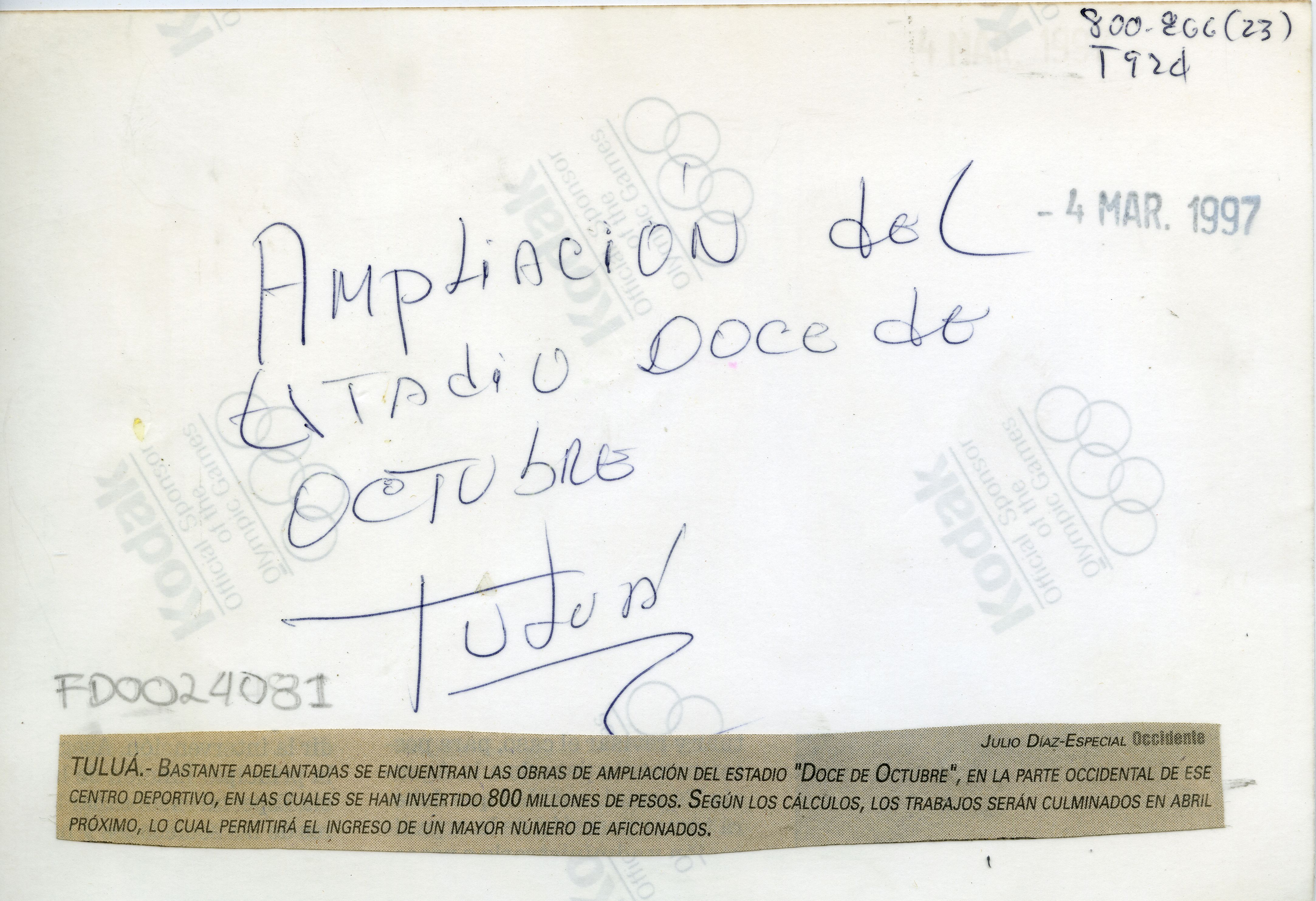 Al reverso de la fotografía se anexa recorte: Tulua. Bastante adelantadas se encuentra las obras de ampliación del estadio "Doce de Octubre", en la parte occidental de ese centro deportivo, en las cuales se han invertido 800 millones de pesos. Según los cálculos, los trabajos serán culminados en abril próximo, lo cual permitirá el ingreso de un mayor número de aficionados