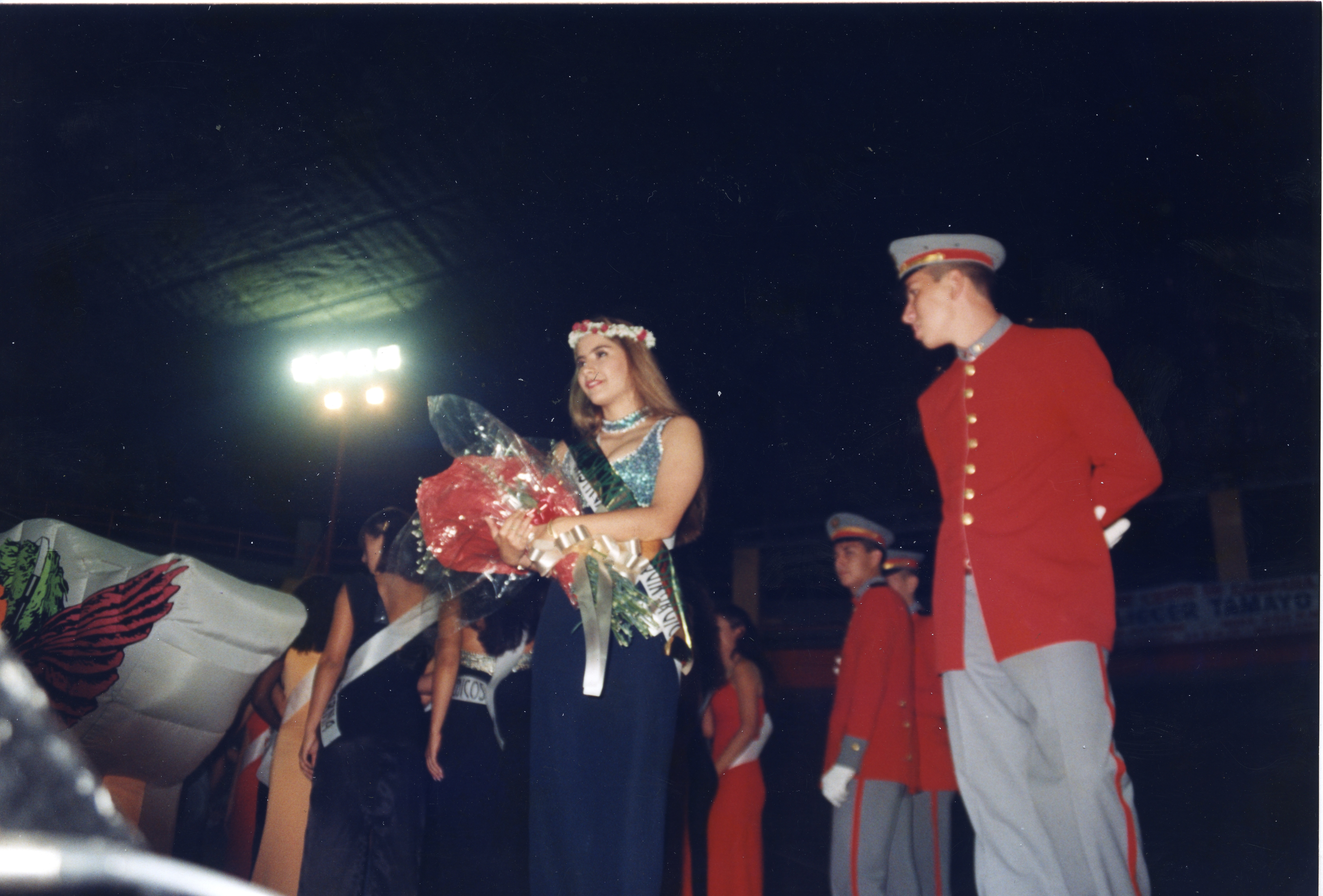 Coronación en reinado institucional. En el centro la ganadora y a un costado el edecán, atrás otras participantes.