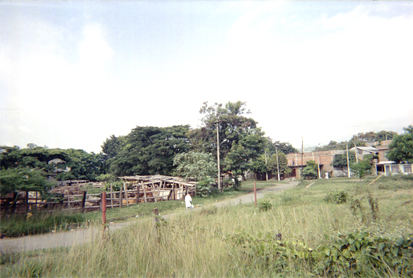 En primer plano lote con maleza. Al lado izquierdo vía destapada. Se observa pesebrera. Al lado derecho viviendas. Plano general.
