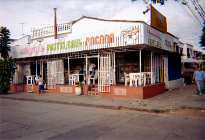 Primer plano. Exterior panadería. El edificio ocupa la mayor porción del espacio visual. El blanco predomina en composición.