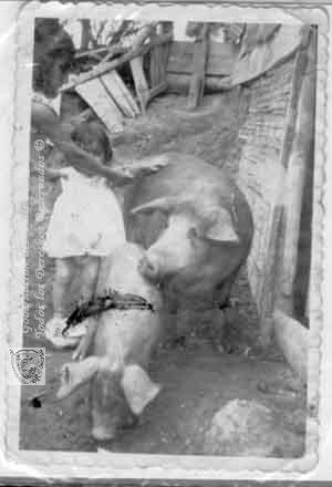 BELISARIO CLAVIJO (1960). La cria de marranos en el solar de la casa era una actividad común, que hacia parte del pan coger para la subsistencia de la familia & 400800. EL AGUILA: Biblioteca Departamental Jorge Garces Borrero.