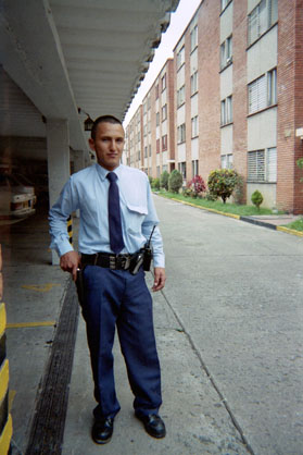Toma frontal de hombre. Plano entero de vigilante con conjunto residencial de fondo. Perspectiva lineal de escenario. Profundidad de campo.