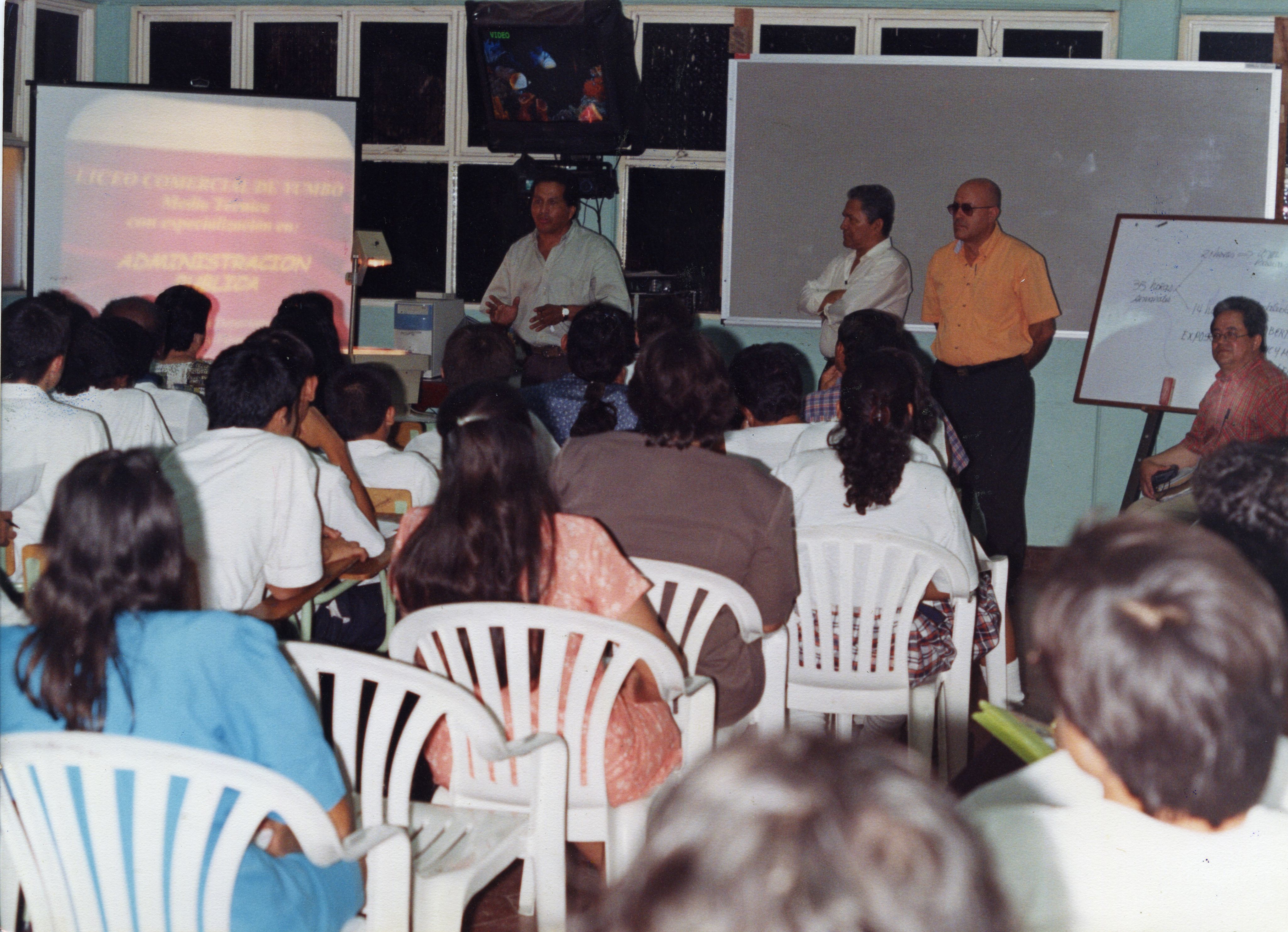 Fotografía de plano medio, donde se puede observar a varias personas sentadas, dando la espalda, también se puede ver al fondo tres hombres de pie y otro sentado sentado, el cual sostiene libros en sus manos, también se ve un tablero cerca de estos y una proyección en una pantalla blanca