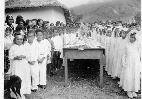 | dc.description | Celebración de la primera comunión. Antiguamente, en los pueblos se acostumbraba hacer un desayuno comunitario para los niños y niñas que recibían el sacramento. Bolivar, 1947. | spa |