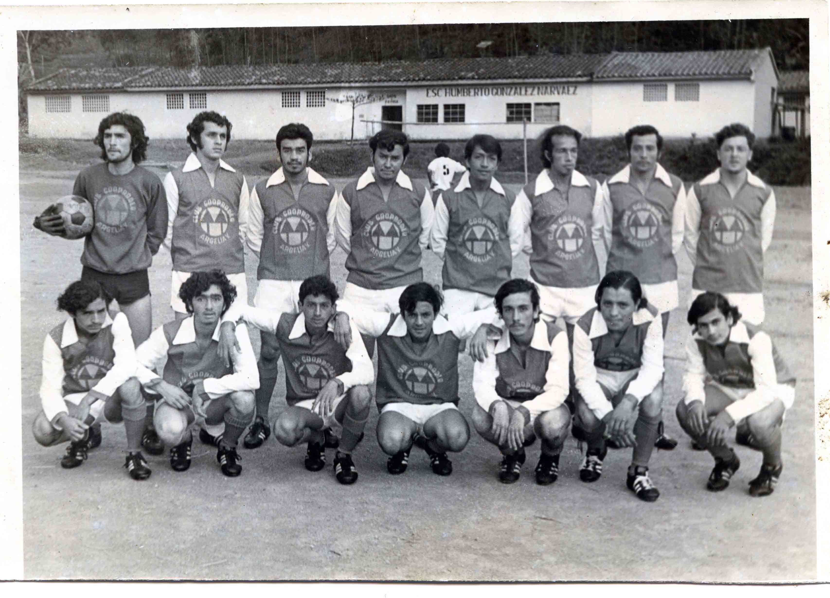 Argelia, Valle del Cauca. Fundado en 1904, por Manuel Mejía, José Antonio Murillo, Epifanio Chávez y Justiano Hincapié. Nombres: Agua Mona y después Medellíncito. Municipio desde 1956. Economía importante en agricultura, caficultura, ganadería, entre otros. Atractivo turístico: Playas del Rio Las Vueltas y sus fiestas patronales. Observamos en la imagen, equipo masculino de fútbol. Se encuentran en la escuela Humberto González Narváez
