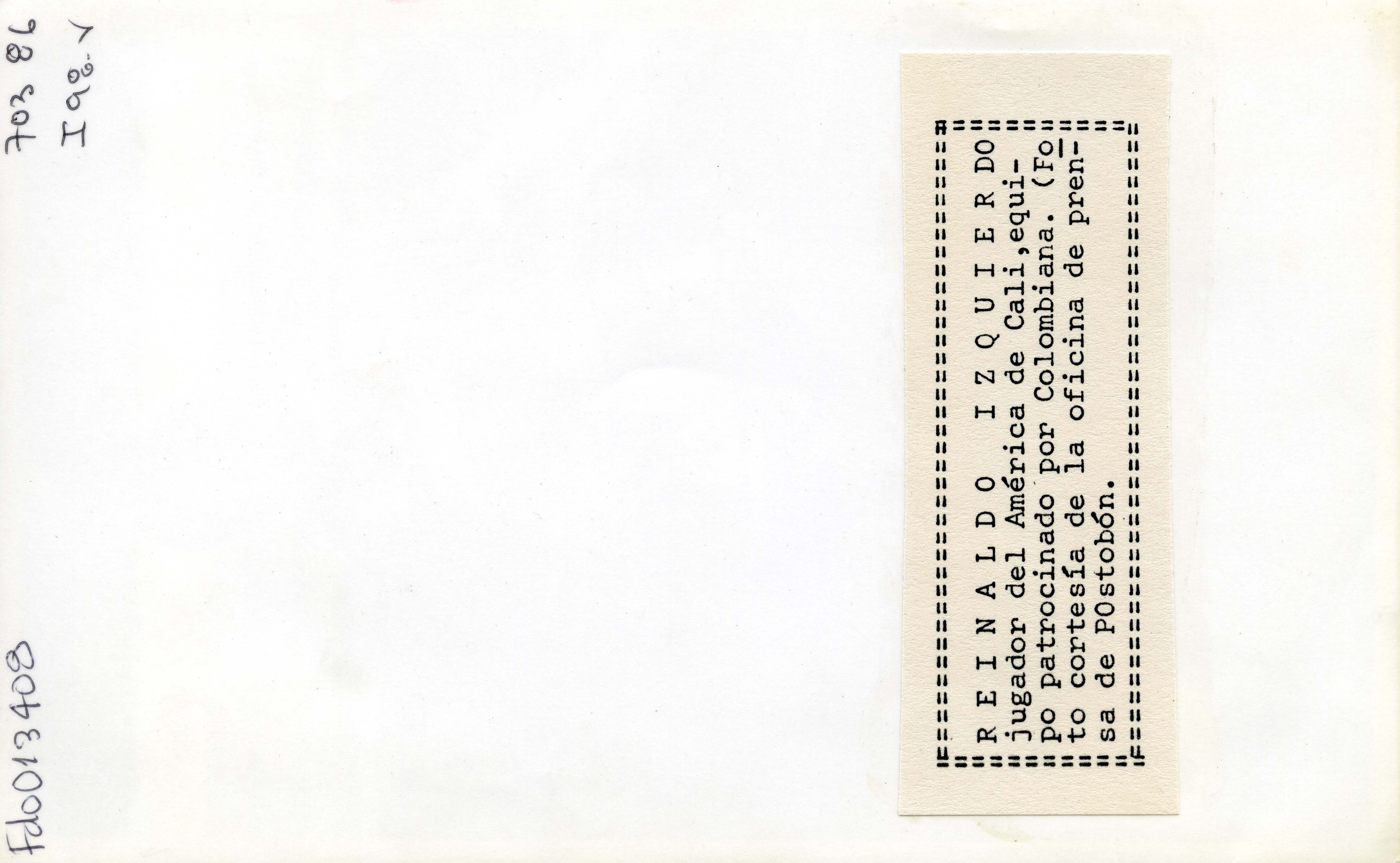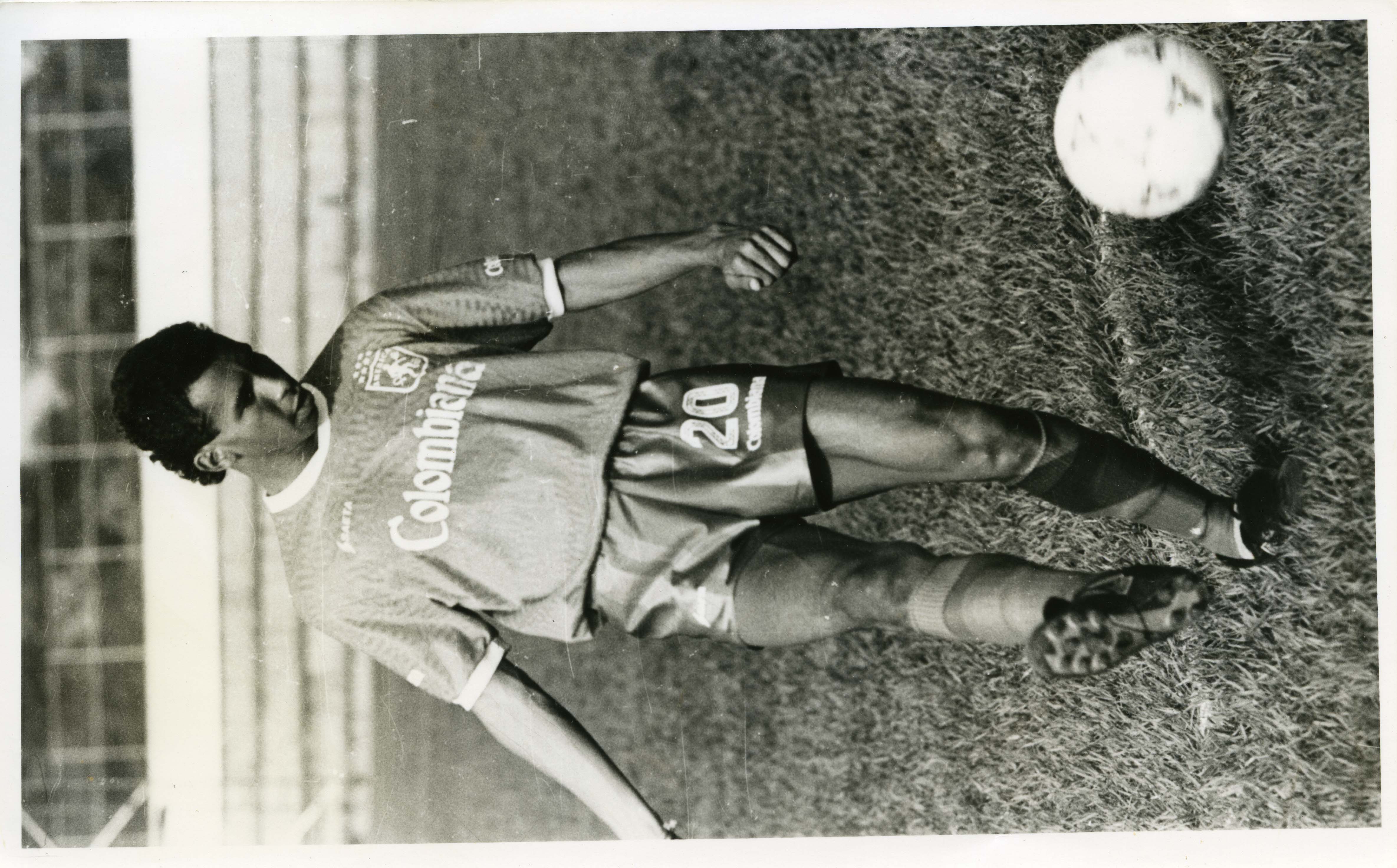 Jugador de fútbol pateando balón. Al reverso de la fotografía dice: Reinaldo Izquierdo jugador del América de Cali, equipo patrocinado por Colombiana.