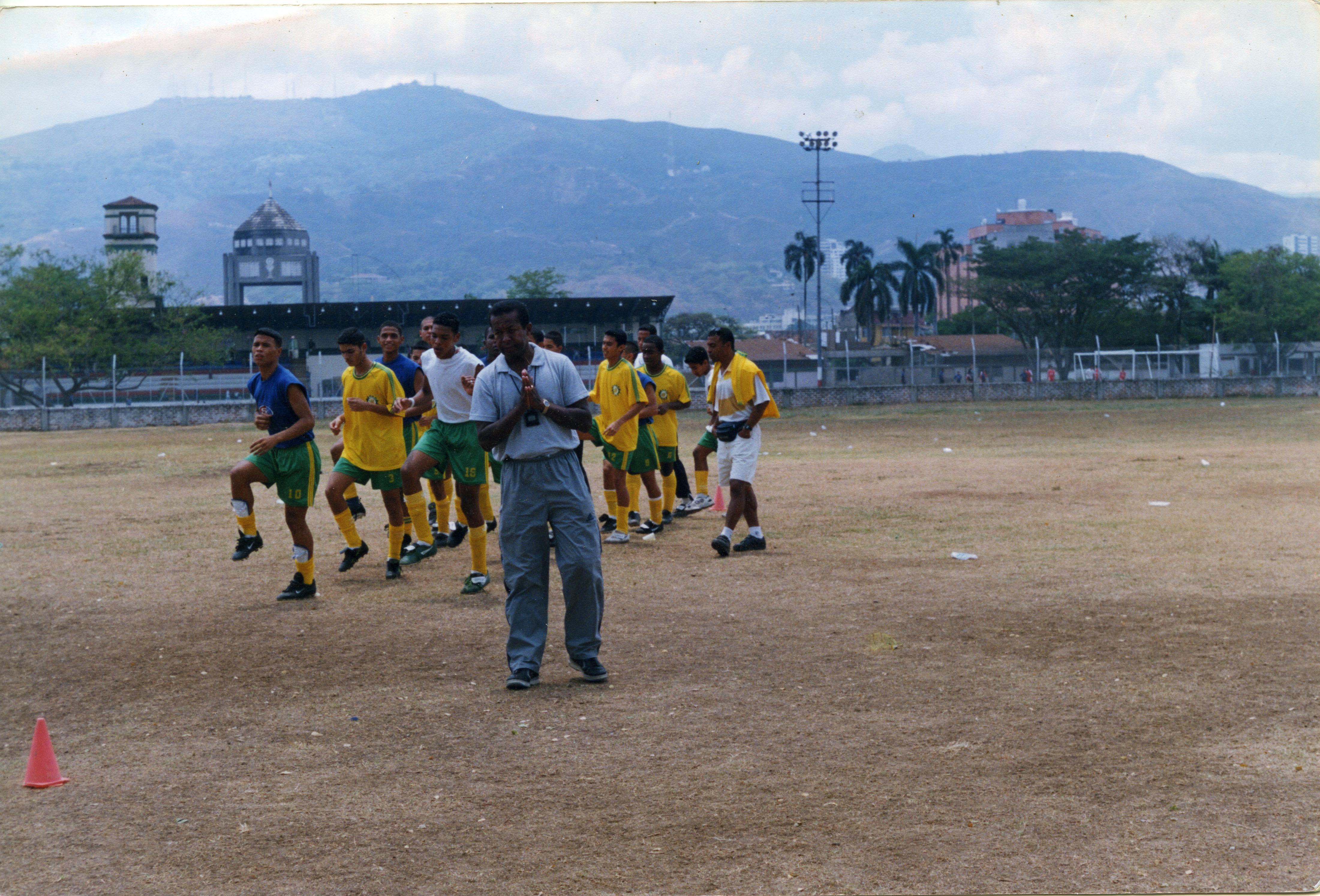 Reverso: En plena acción de calentamiento, la Selección Juvenil de Yumbo en uno de sus últimos compromisos, en la Sultana del Valle. Horacio Cardona y Turco González, acompañan al onceno.