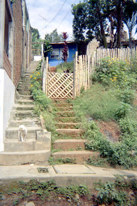 | dc.description | Plano medio de contexto. Exterior día. Escaleras en costado izquierdo con perro. Casa con verja en guadua en centro superior de cuadro escénico. | spa |
