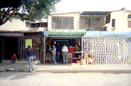 Plano medio contextual. Toma frontal de punto comercializador de víveres con ciudadanos en cuadro escénico. Niño de perfil en lateral izquierdo.