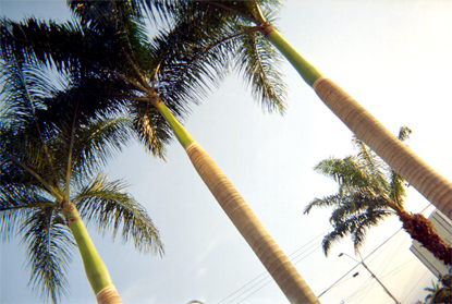 Tres palmas y una más pequeña en el cuadrante inferior derecho. Toma en contrapicado diagonal. Exterior día. Plano general.