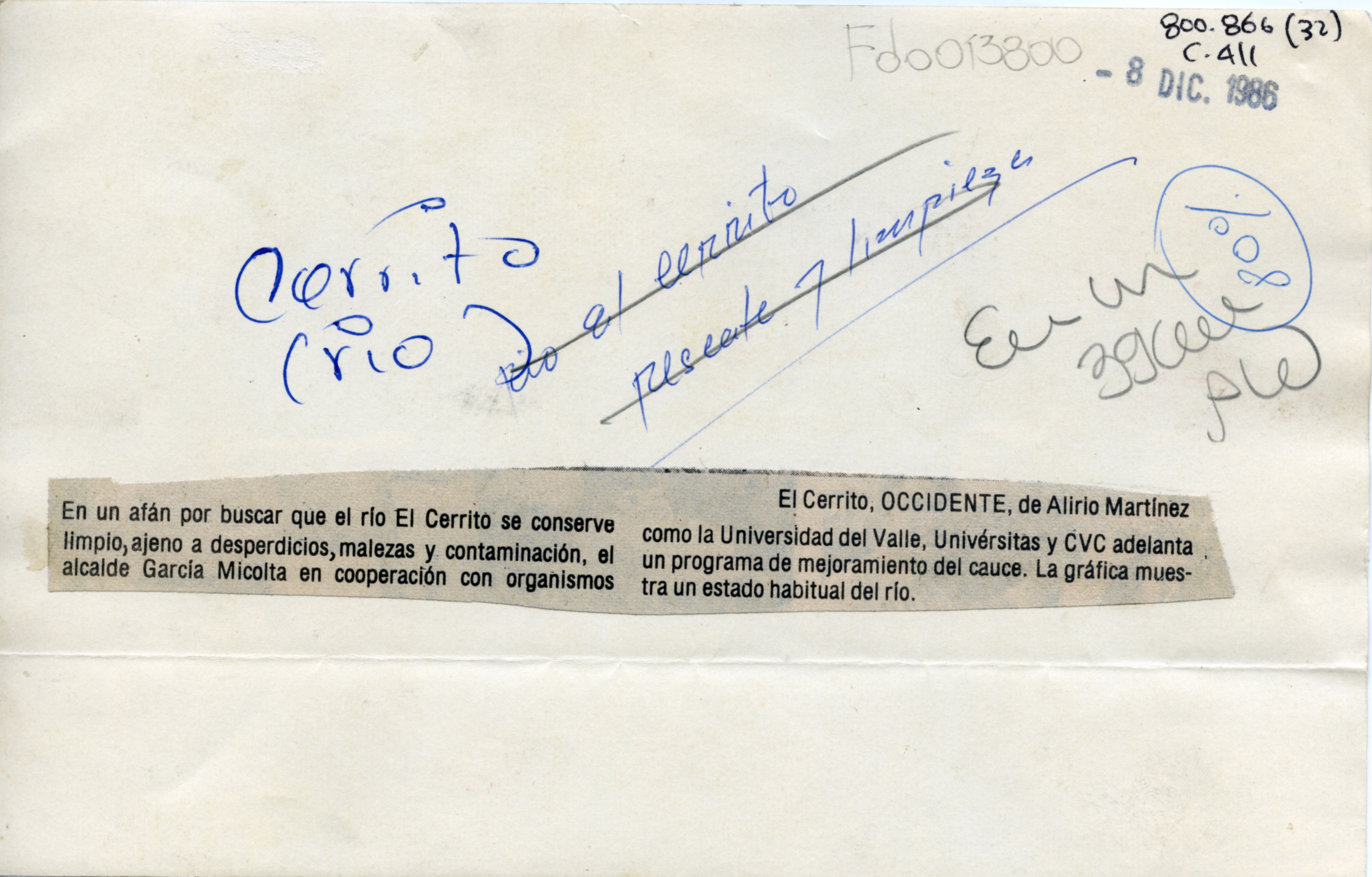 Al reverso de la fotografía se anexa el recorte." En un afán por buscar que el río El Cerrito se conserve limpio,ajeno a desperdicios, malezas y contaminación, el alcalde García Micolta en cooperación con organismos como la Universidad del Valle, Univérsia, CVC adelanta un programa de mejoramiento del cauce. La gráfica muestra un estado habitual del río".