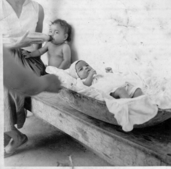 Madre alimentando con tetero a su niño, mientras el más bebé duerme en una batea demadera. Hacienda las Las Lajas. Zarzal, 1955.