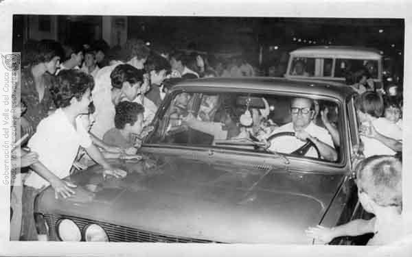 Fiestas municipales en las cuales se contó con la presencia de la reina del Chocó a quien vemos en el automóvil conducido por don Fernando Henao. Caicedonia, 1975.