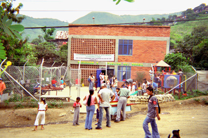 Plano Medio.  En al imagen se observan unas personas reunidas frente a una casa de dos pisos. Detrás de la construcción se observa vegetación abundante.