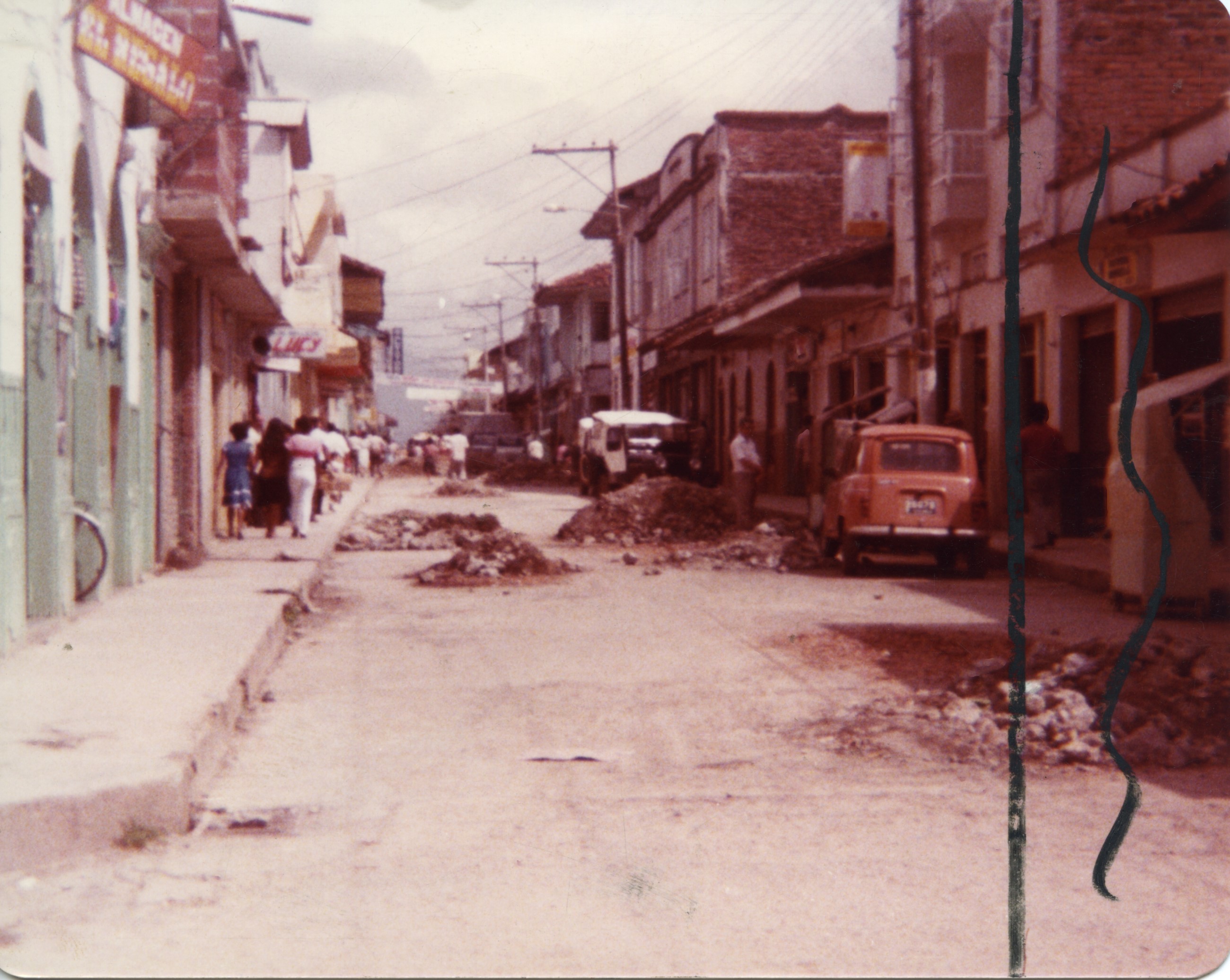 Al reverso de la gráfica se anexa el pie de foto: "Reparación. Aspecto que se observa con frecuencia en la calle Miranda, una de las vías urbanas más importantes del municipio. Es necesario que la calle sea repavimentada en su totalidad, para que la administración economice el dinero que invierte cada rato en su reparación." Se observan montones de escombros en la calle, y al costado izquierdo un carro Renault 4 color naranja.