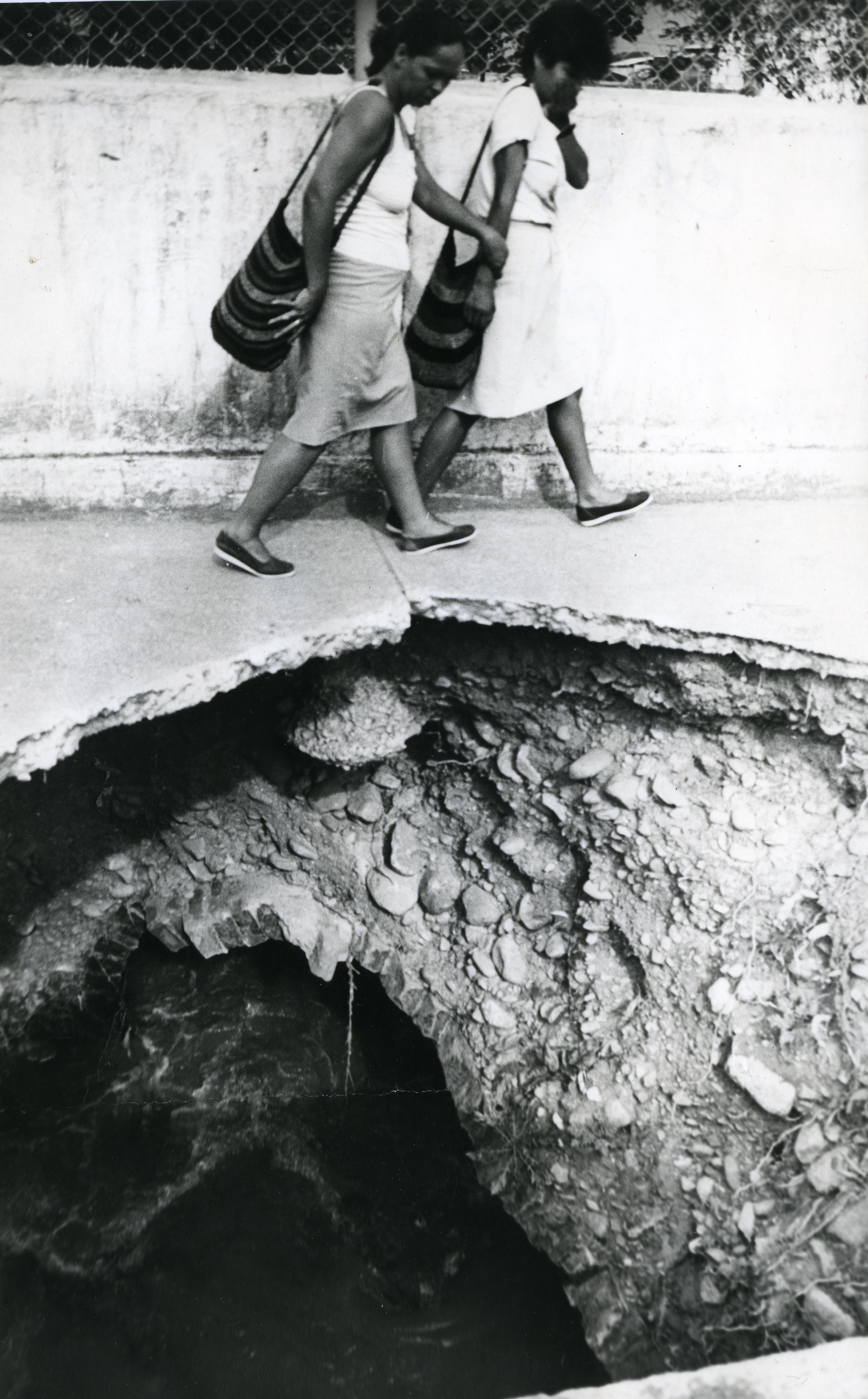 En la gráfica se aprecia huecos en en un sector de Cali. Observamos dos mujeres caminando por el lugar