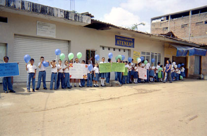 Perspectiva lineal de escena. Exterior día. Plano medio conjunto. Niños en formación continua en protesta, contra basuro Jimena.