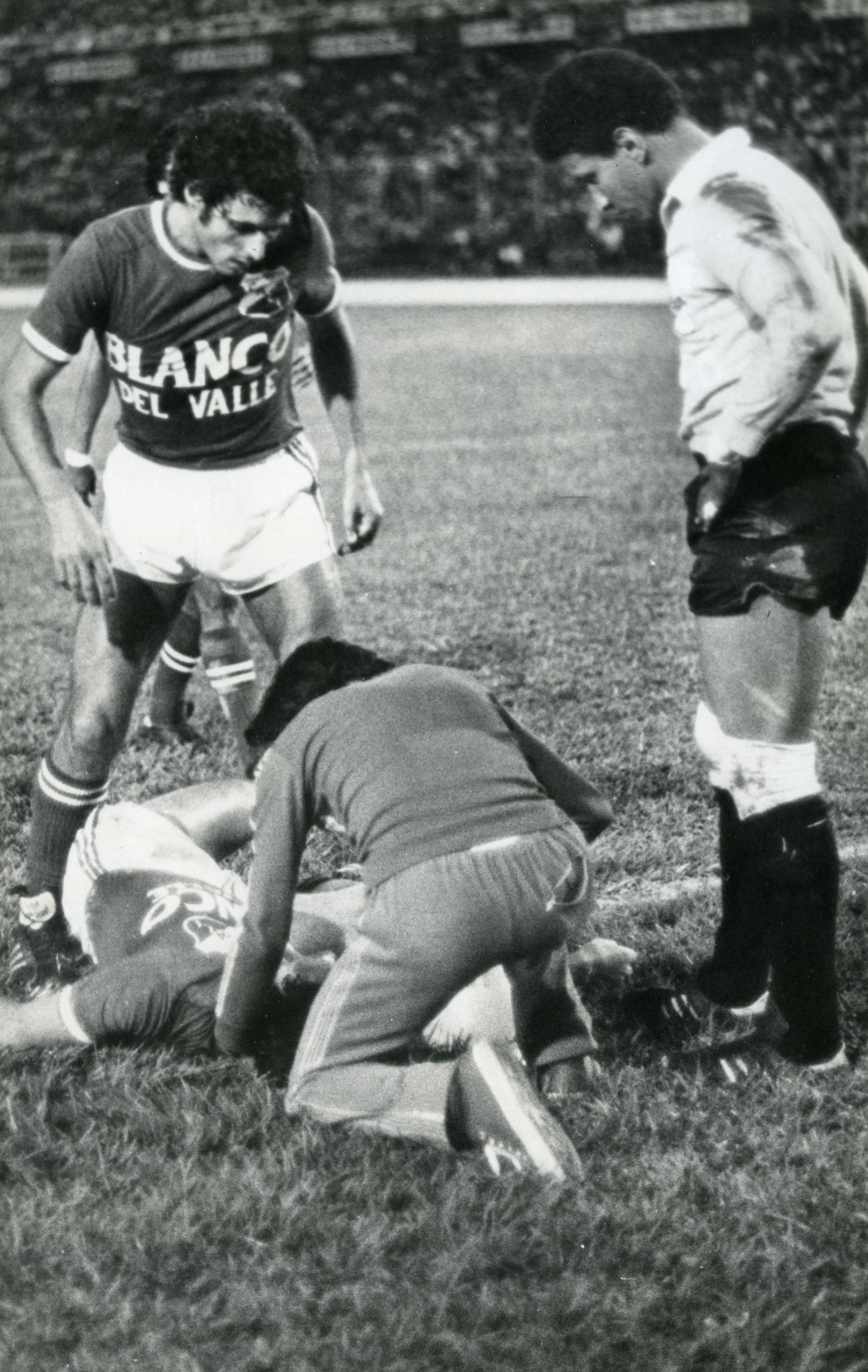 Partido entre los equipos de fútbol, Deportivo Cali vs Millonarios, realizado en el estadio Olímpico Pascual Guerrero de la ciudad de Cali. Se aprecia jugador caleño lesionado tendido en el suelo y el portero Pedro Antonio Zape observa mientras se atiende al jugador
