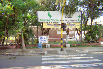 Henríquez Acuña, Y. (2005). Imagen tomada en exterior, donde se puede apreciar algunos avisos publicitarios, junto a la fachada de una institución, elaborada en ladrillo y malla. Santiago de Cali: Biblioteca Departamental Jorge Garces Borrero.