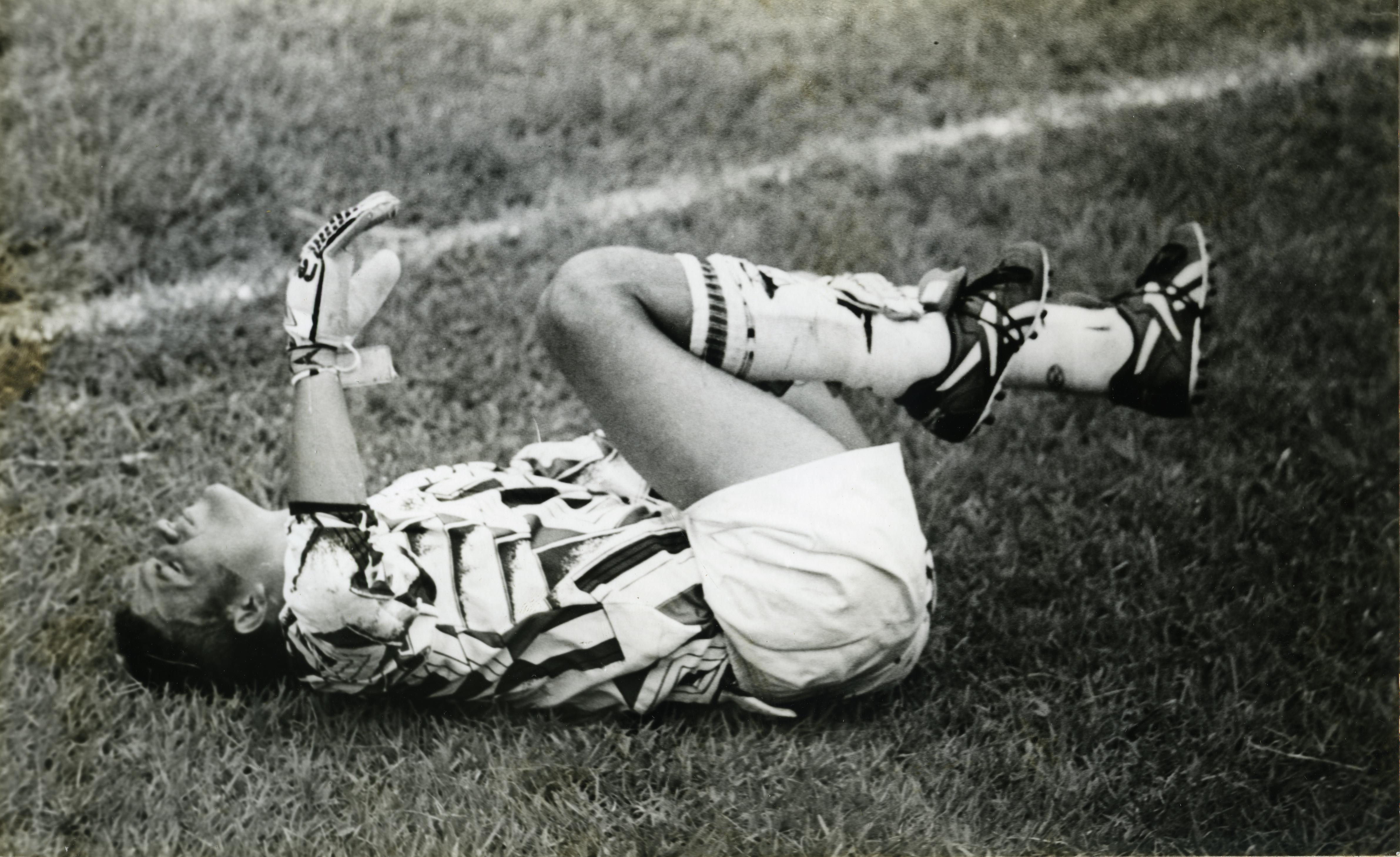 En la gráfica se observa al futbolista Raúl Larrahondo, acostado en medio de una cancha de fútbol.
