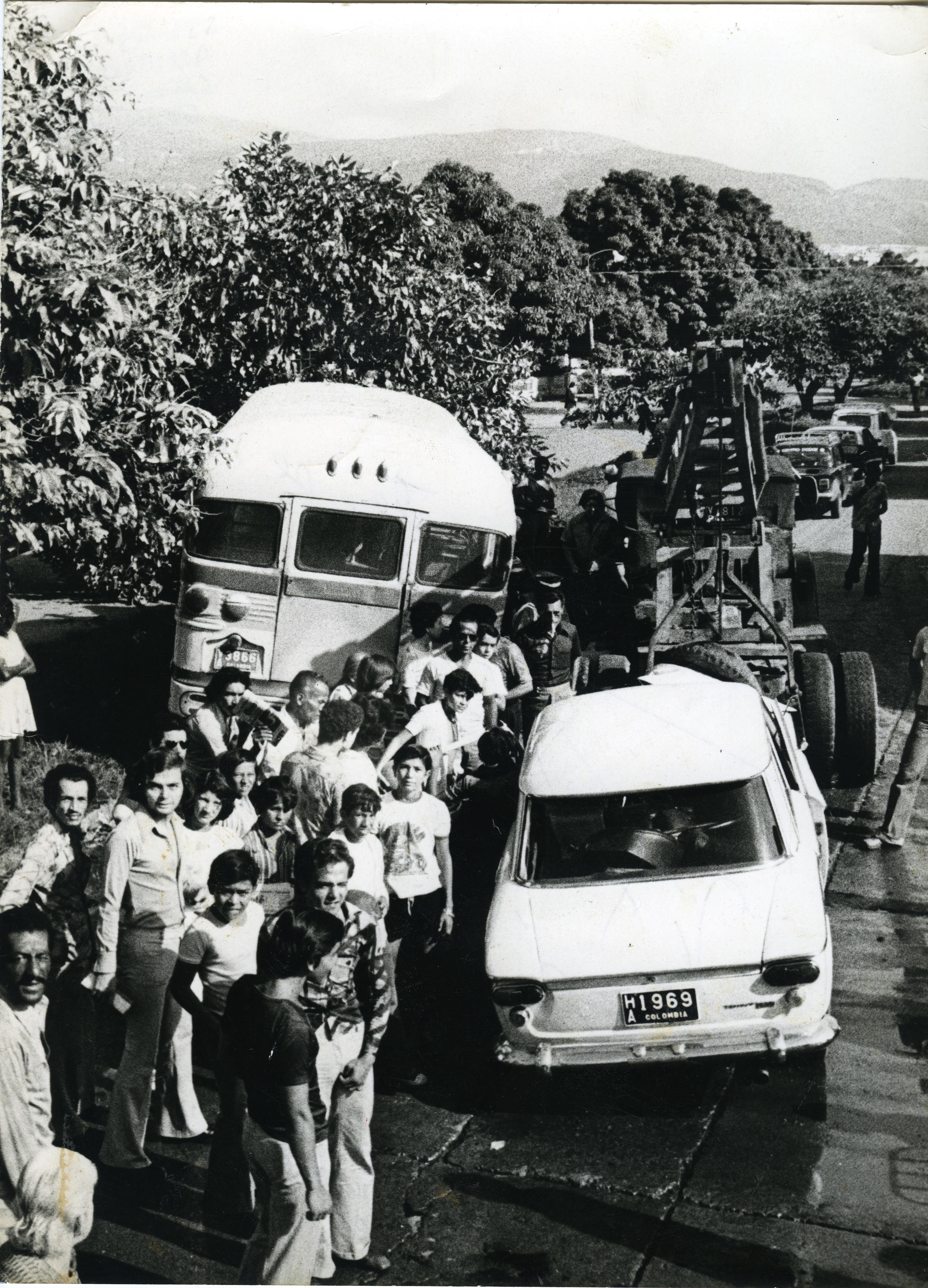 En la gráfica se observa un automóvil siendo remolcado por una grúa. A la izquierda de este se observa un bus subido en el separador. Algunas personas se amontonan alrededor del hecho.