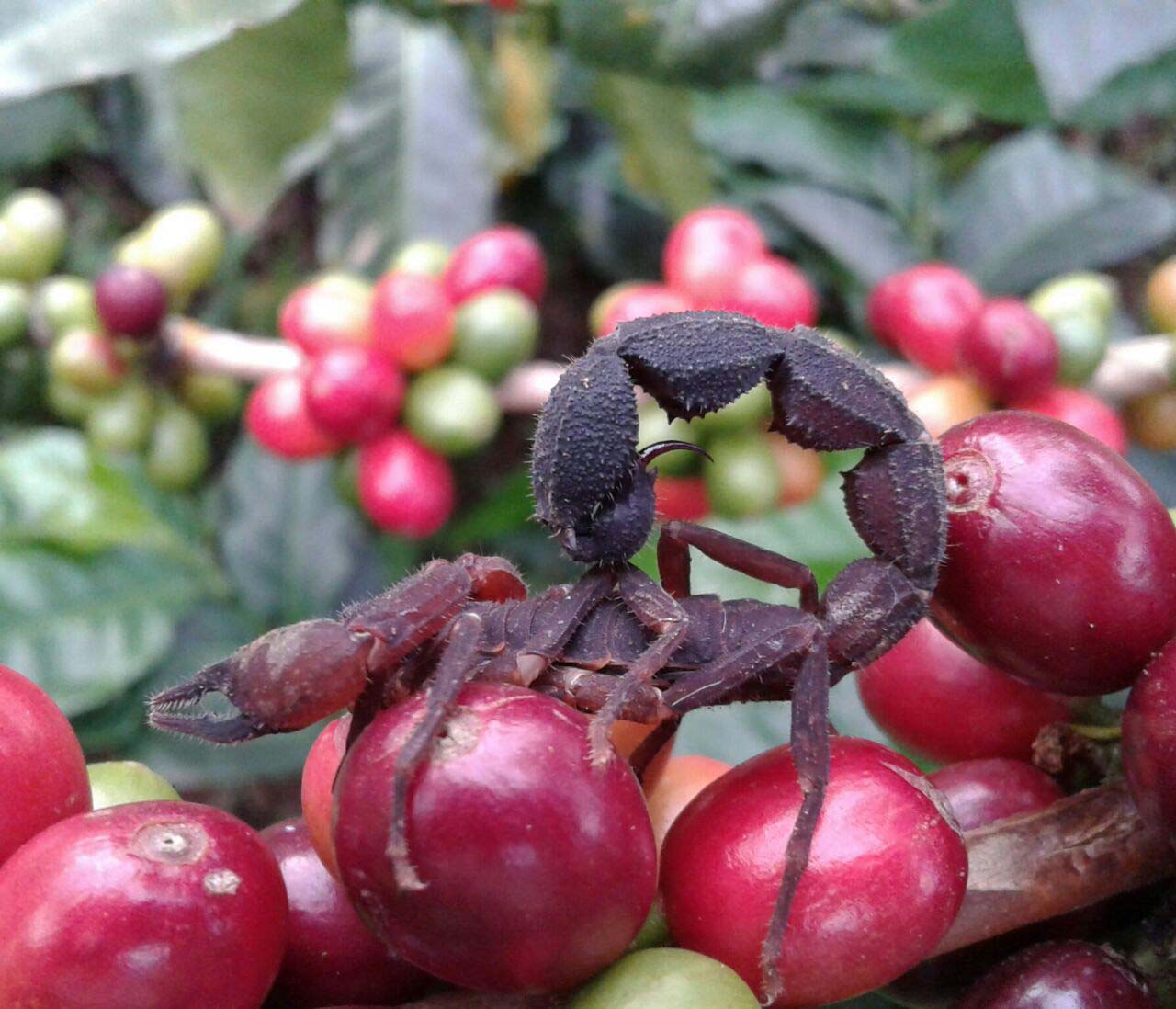 El Águila, Valle del Cauca. Fundado en 1899, por Emelecio Duque, Marcelino Echeverri y los hermanos Bernardo y Natalio Serna. Municipio desde 1953. Economía importante en agricultura, caficultura, ganadería, minería, explotación forestal, etc. Observamos en la imagen, café cereza. Se Aprecia un bicho en el cafeto
