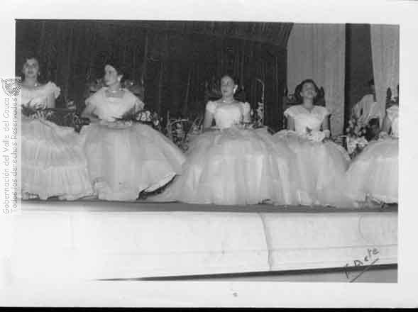Acto de graduación como bachilleres celebrado en el Teatro María Cristina. Las graduandas Rita Cruz, Clara Inés Vélez, Teresita Vergara, Chila Márquez Buga, C. 1950.