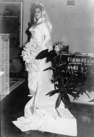 FOTO RAYO (1959). Novia de Alvaro Arango con su vestido de matrimonio que se destaca por su larga cola, tal como se usaba anteriormente y el gran arreglo floral que lleva en sus manos & 600768. CARTAGO: Biblioteca Departamental Jorge Garces Borrero.