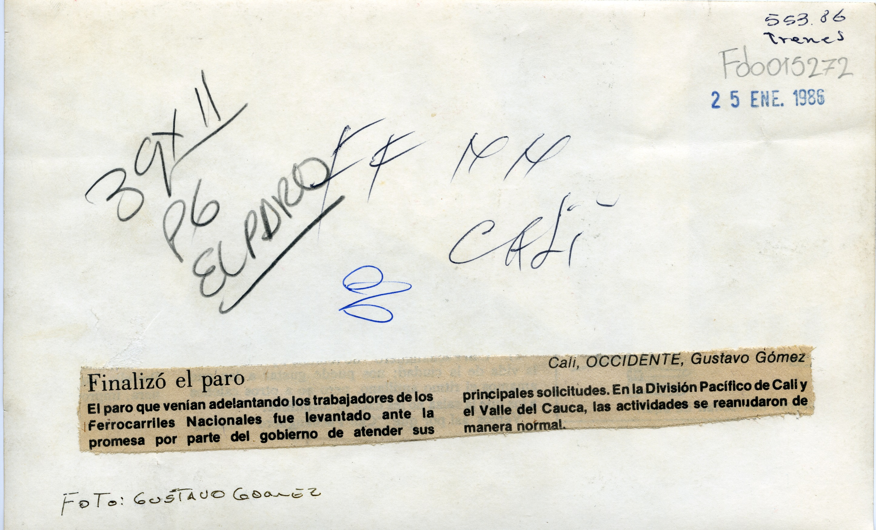 Estación de tren. Observamos tren 1634. Al reverso de la fotografía se anexa el pie de foto del periódico: “Finalizó el paro. El paro que venían adelantando los trabajadores de los Ferrocarriles Nacionales fue levantado ante la promesa por parte del gobierno de atender sus principales solicitudes. En la División Pacífico de Cali y el Valle del Cauca, las actividades se reanudaron de manera normal”.