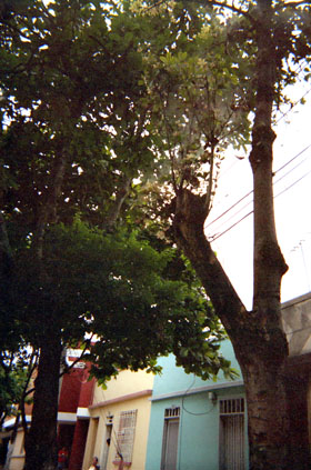 Plano medio. Vivienda. Sobredimensión del árbol en relación con las casas. Sobresale textura rugosa de tronco en lateral derecho.