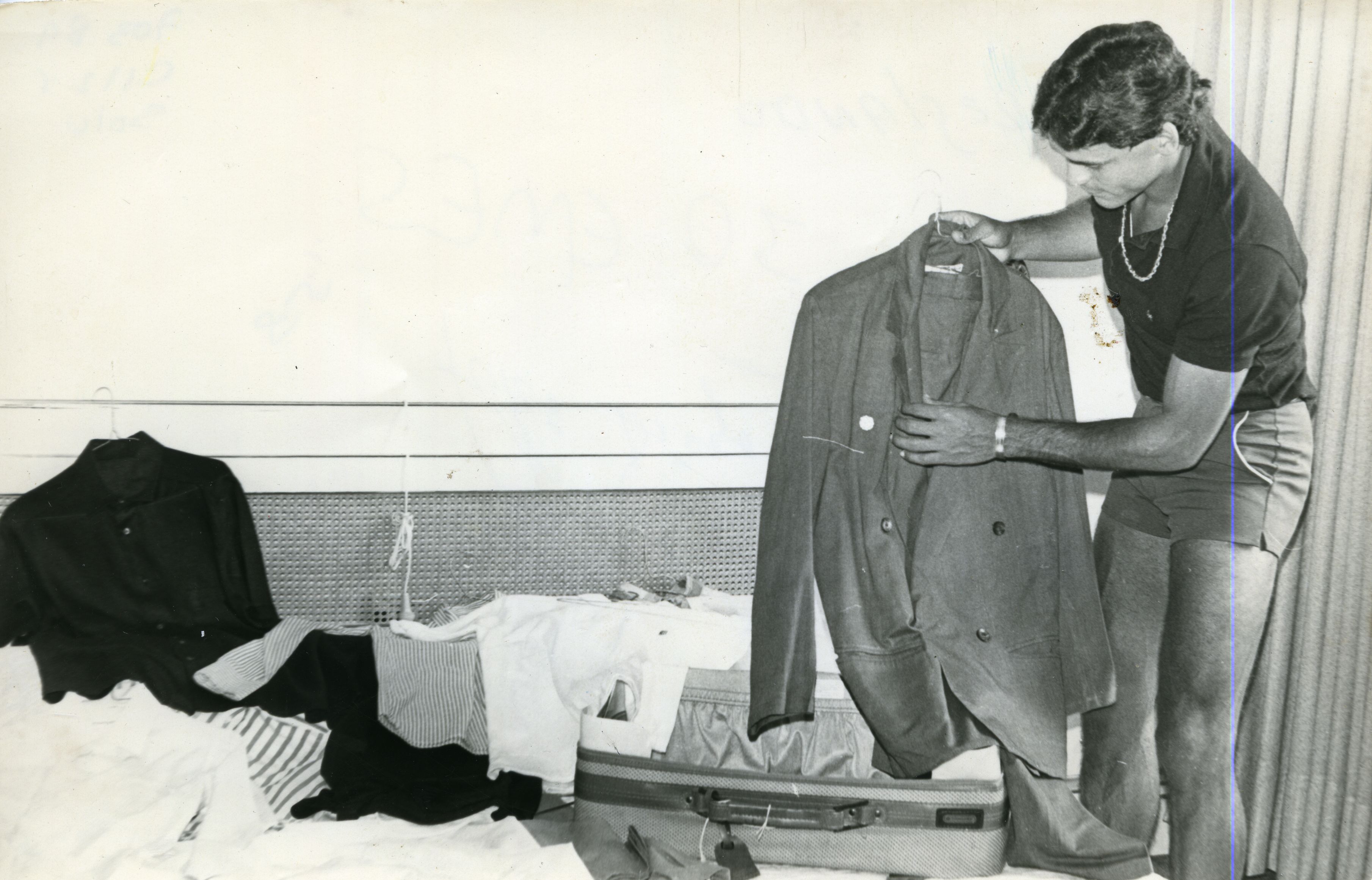 Roberto Cabañas González, futbolista paraguayo que formo parte del América de Cali como nueva contratación en los años 1985 - 1987. Se aprecia al jugador arreglando la ropa