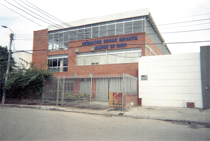 Plano medio. Imagen tomada en exterior, donde se puede apreciar una fachada con muros de ladrillo a la vista, donde funciona la fundación, hogar infantil, Madre de Dios.
