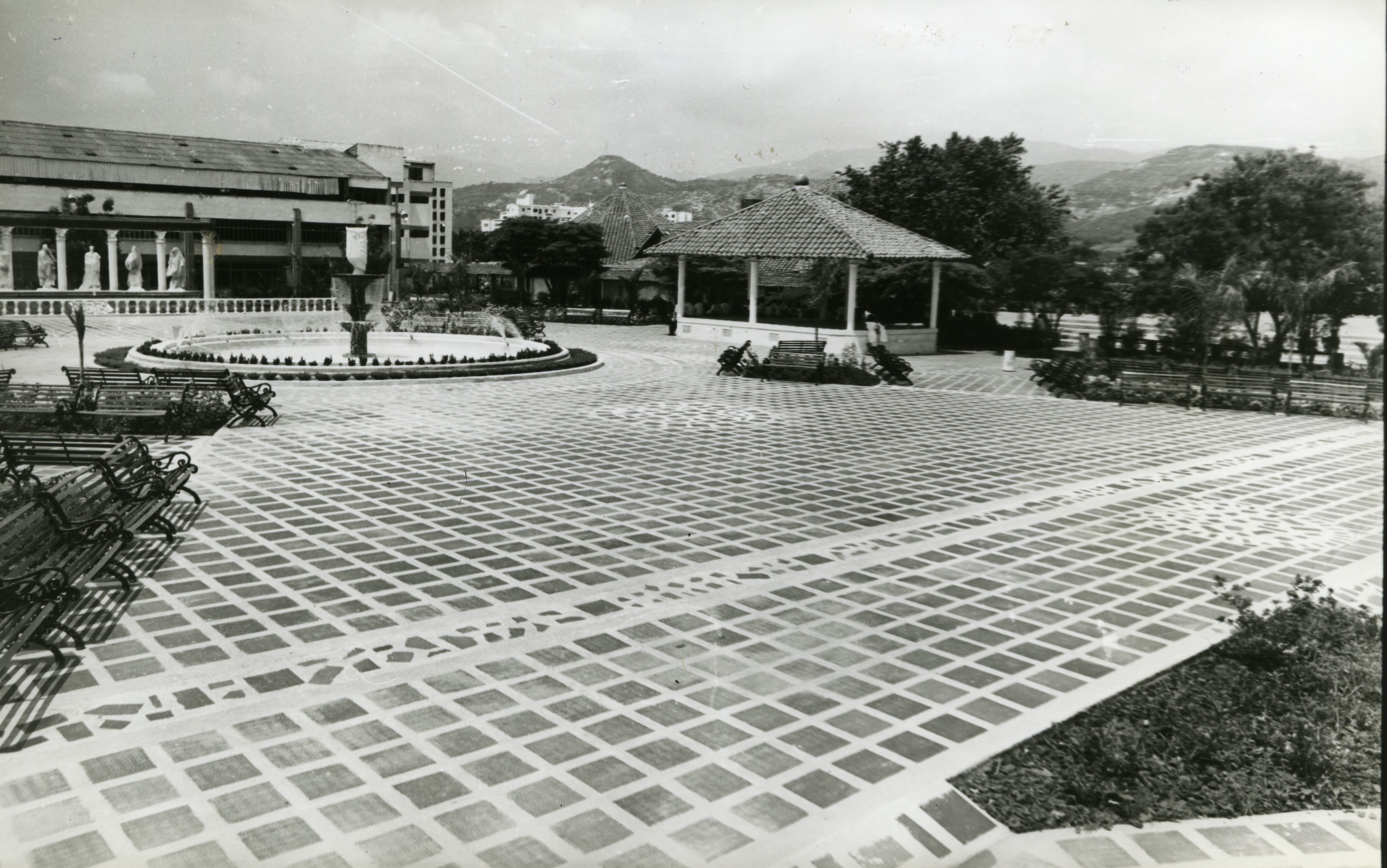 En la fotografía se observa la plazoleta de la Universidad, como un lugar de transito y descanso. Se resalta la fuente al centro de la plazoleta, el diseño de jardines, bancas, unos monumetos y arborización. Al reverso dice: ¨Parque Universidad Santiago de Cali¨