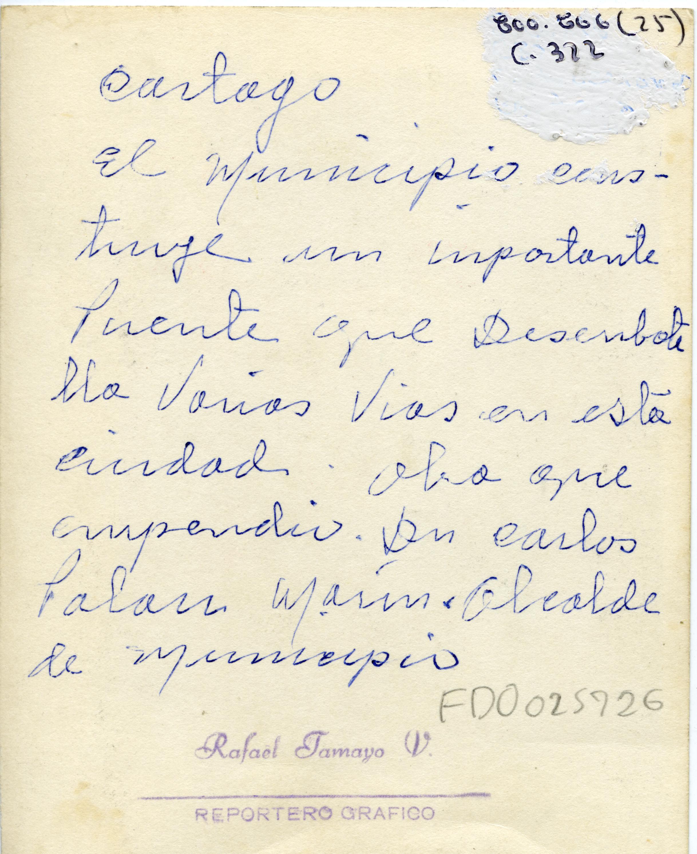 | dc.description.abstract | Cartago. El municipio construye un importante puente que desembotella varias vías en esta ciudad obra que emprendio don Carlos Palau Marín alcalde del municipio | spa |