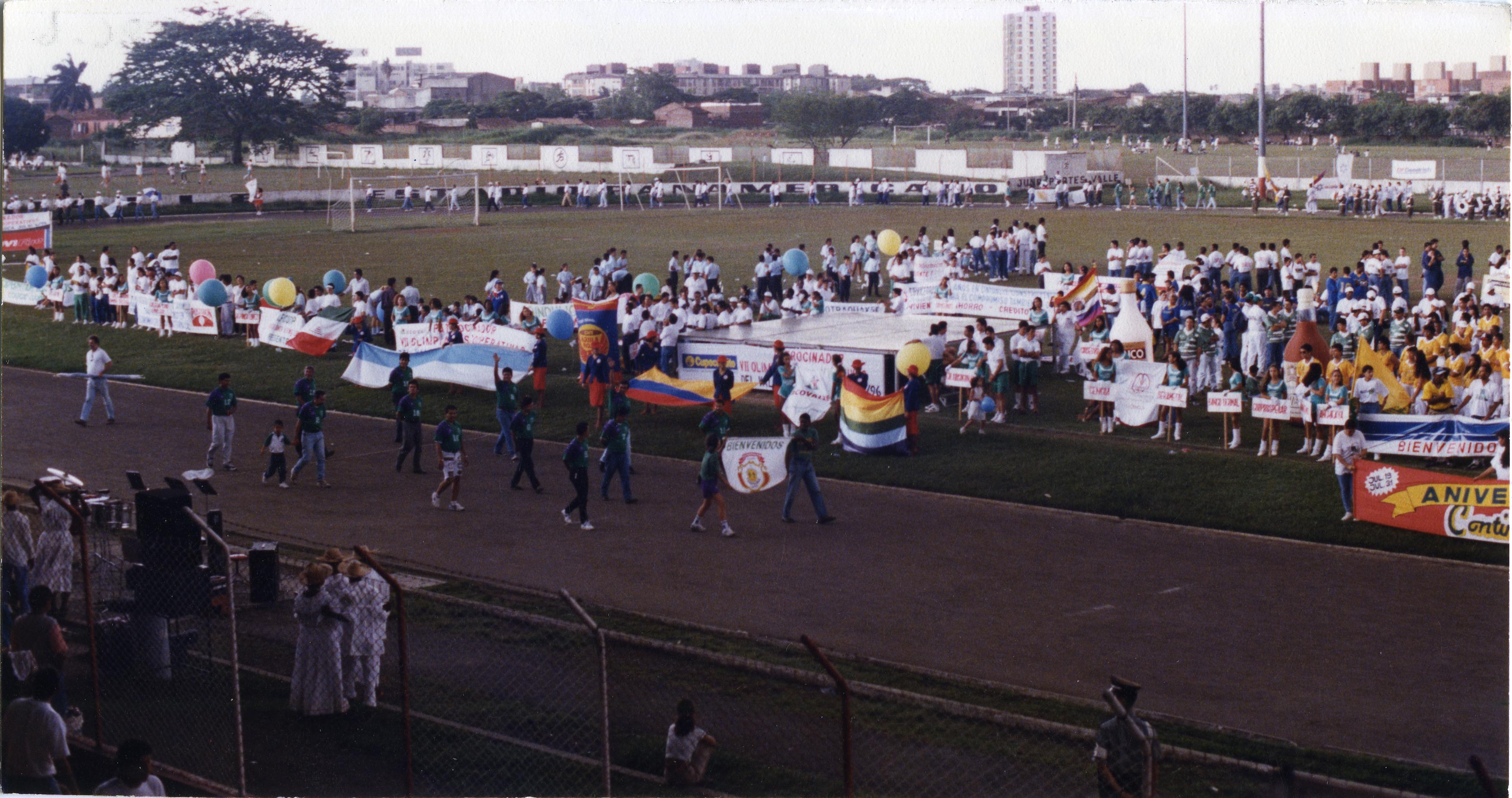 En la gráfica se observan unas personas desfilando y cargando un letrero de bienvenida. Esto en contexto de las VII Olimpiadas del Sector Cooperativo. Junto al desfile se observan varias personas formadas sosteniendo banderas y letreros alrededor de una tarima.