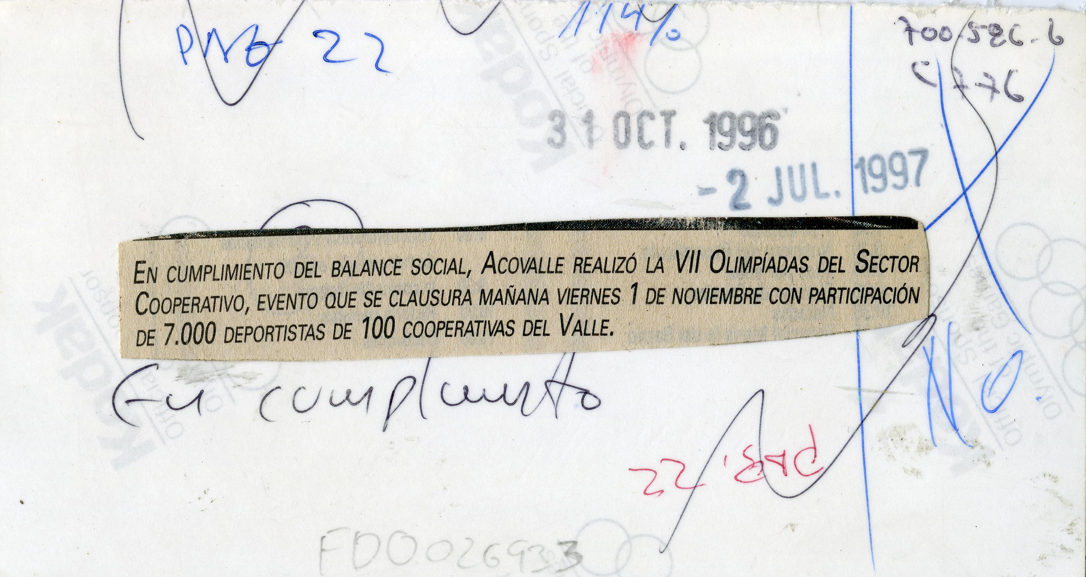 Reverso: En cumplimiento del Balance Social, Acovalle realizó la VII Olimpíadas del Sector Cooperativo, evento que se clausura mañana viernes 1 de noviembre con participación de 7.000 deportistas de 100 cooperativas del Valle.