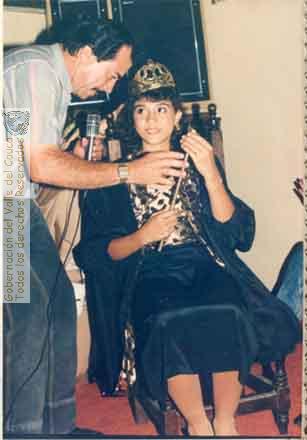 La señorita Claudia Patricia Echavarria, 1ra. reina del Colegio Pablo Emilio Camacho Perea, junto al profesor Rafael Núñez. Zarzal, 1987.