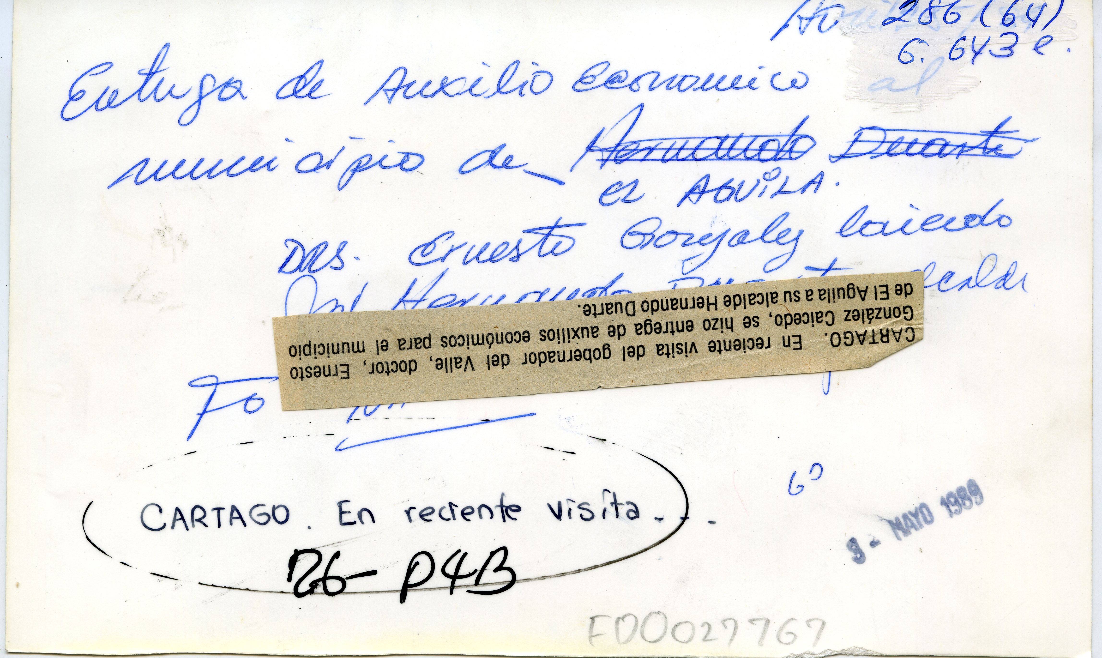"Reverso: CARTAGO. En reciente visita del gobernador del Valle, doctor, Ernesto González Caicedo, se hizo entrega de auxilios económicos para el municipio de El Águila a su alcalde Hernando Duarte."
