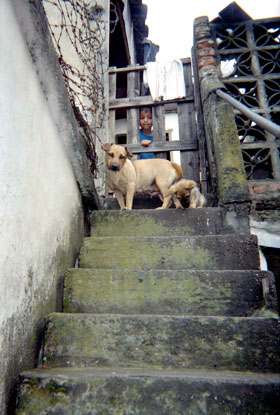Plano medio. Toma realizada en contrapicado, donde se aprecia en el centro de la imagen unas gradas que conducen hacia dos perros y un niño en la parte superior, que asoma a través de una puerta en madera.
