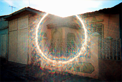 Plano medio. Fachada de la residencia del autor. Toma en contraluz que generó efecto de aureola en la imagen. Rejas de seguridad en la fachada. antena de televisión (clásica) en el tejado lado izquierdo.
